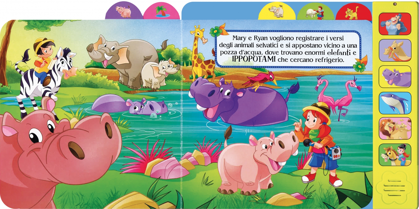 Immergiti in un mondo di versi con il libro sonoro sugli animali. Tra una pagina e l’altra scoprirai tante cose su queste grandi creature: come sono, dove vivono e che versi fanno.