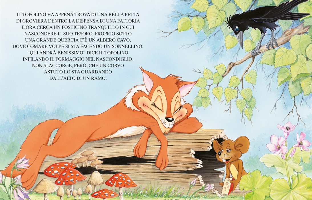 lezione di coraggio e saggezza, “I tre porcellini” che insegnano l’importanza dell’impegno e dell’ingegnosità. “La cicala e la formica” ci ricorda la rilevanza del lavoro e della preparazione, mentre “La lepre e la tartaruga” ci insegna che con la costanza si può arrivare lontano. L’astuzia è il tema portante de “Il corvo e la volpe” mentre la generosità e l’umiltà sono gli elementi chiave de “Il leone e il topo”. Storie che ci ricordano che i valori fondamentali sono sempre attuali."